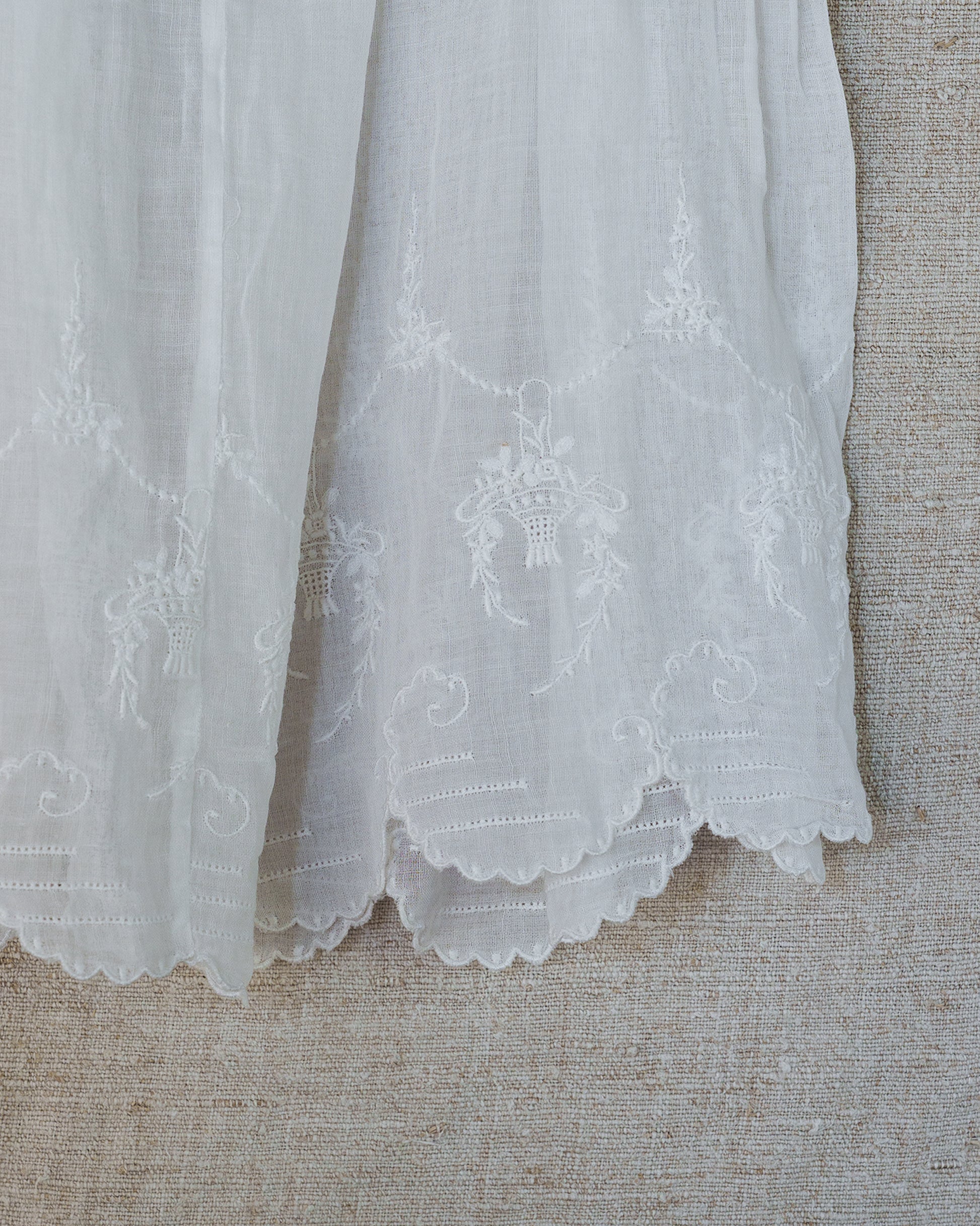 This sweet dress with delicate embroidery around the bib and trim is beautiful, light and sheer. It would make a wonderful night dress or day dress paired with tights.
