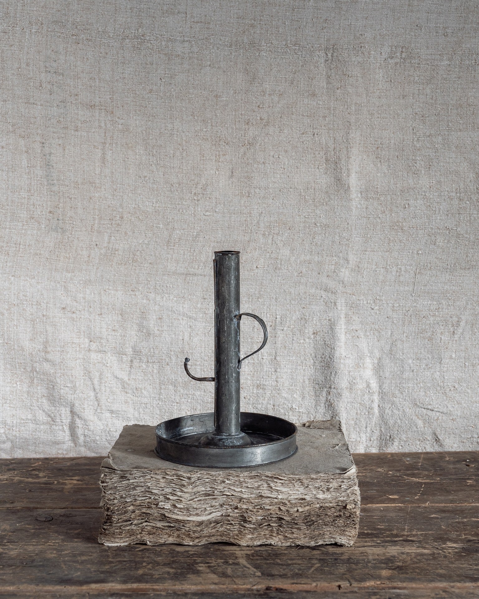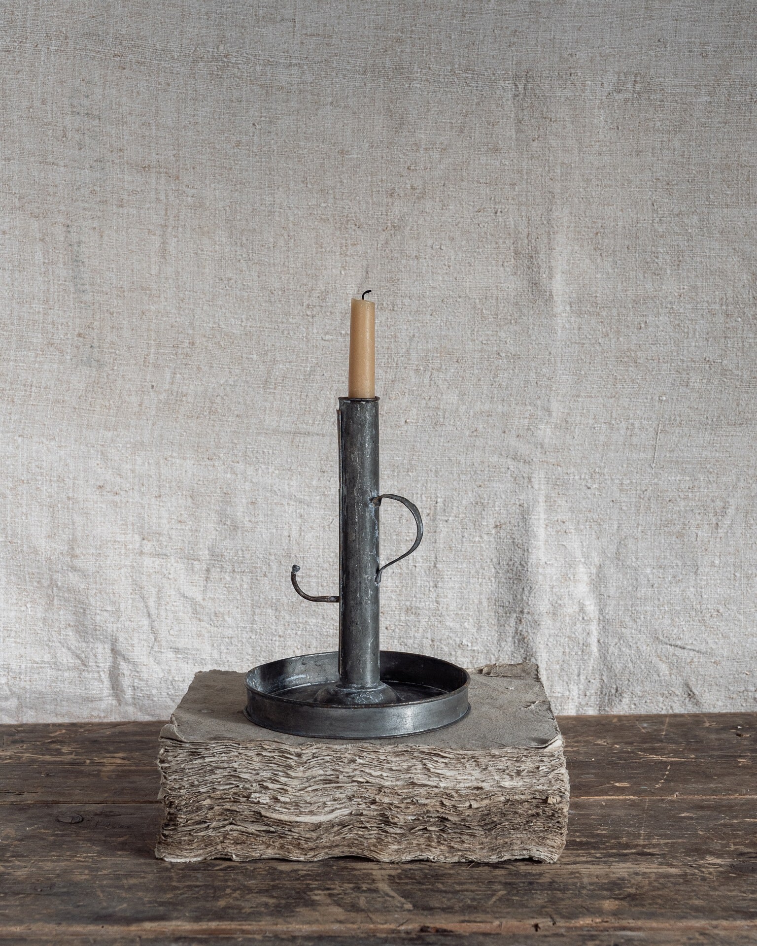 An antique iron candlestick holder, it features a clever raise and lower mechanism to adjust as your candles burn.
