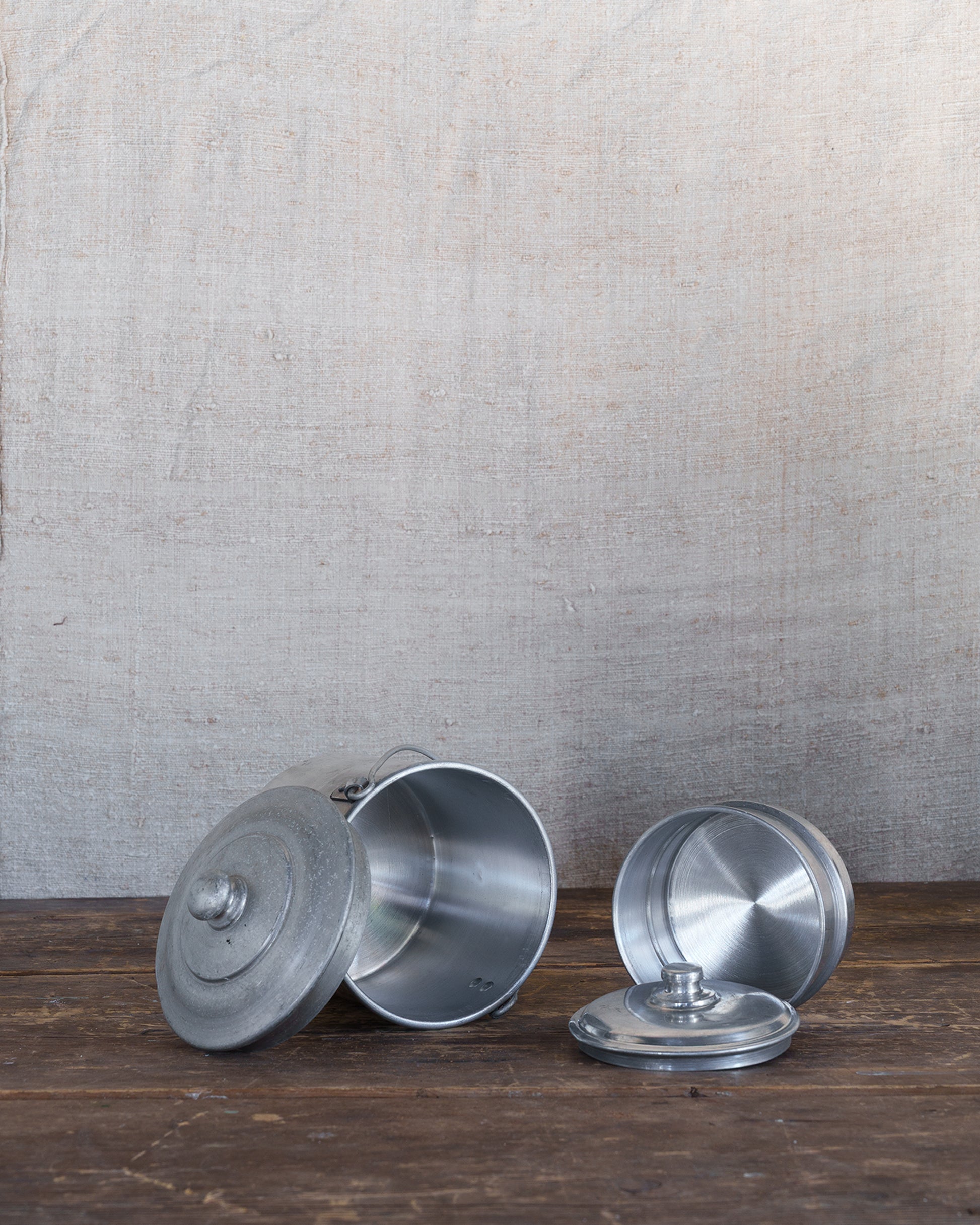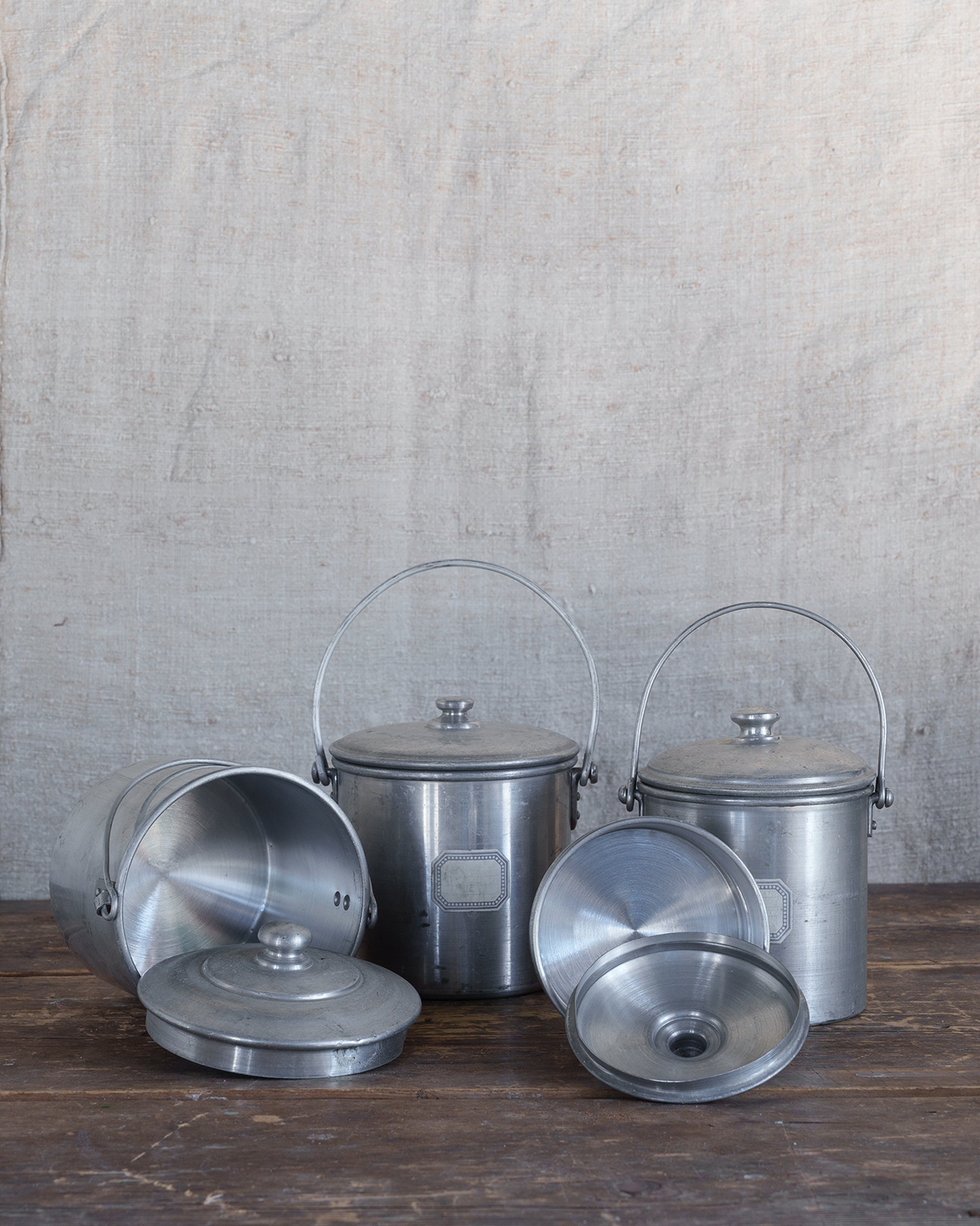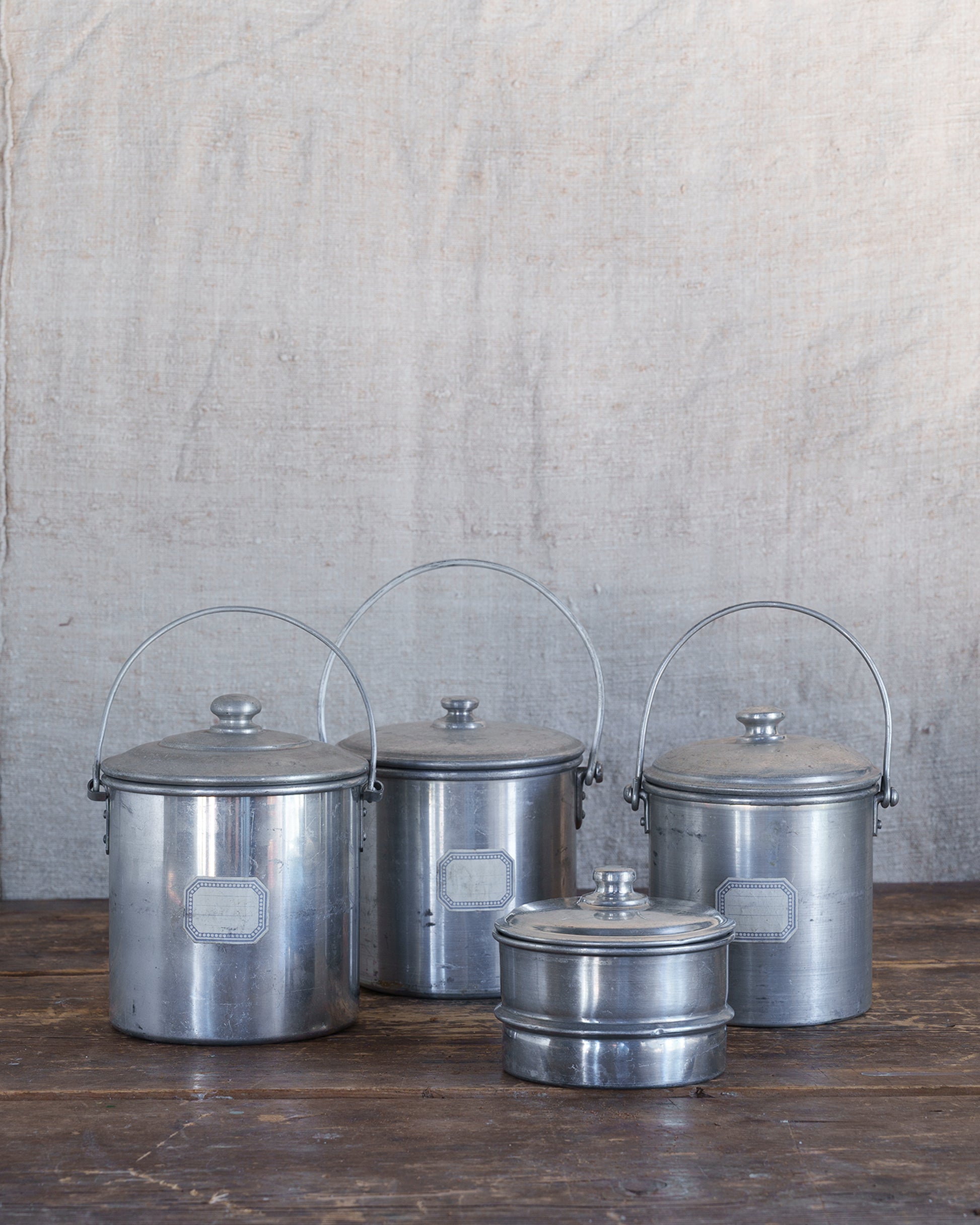 These vintage aluminium tins, complete with handled lids and labels, were once children's snack boxes, to store their "gouter", the after school snack in France, enjoyed around 4.30pm. Sourced at a favourite Saturday brocante, we imagine these being used in the same way again, or as storage tins for dried goods in your kitchen or pantry.