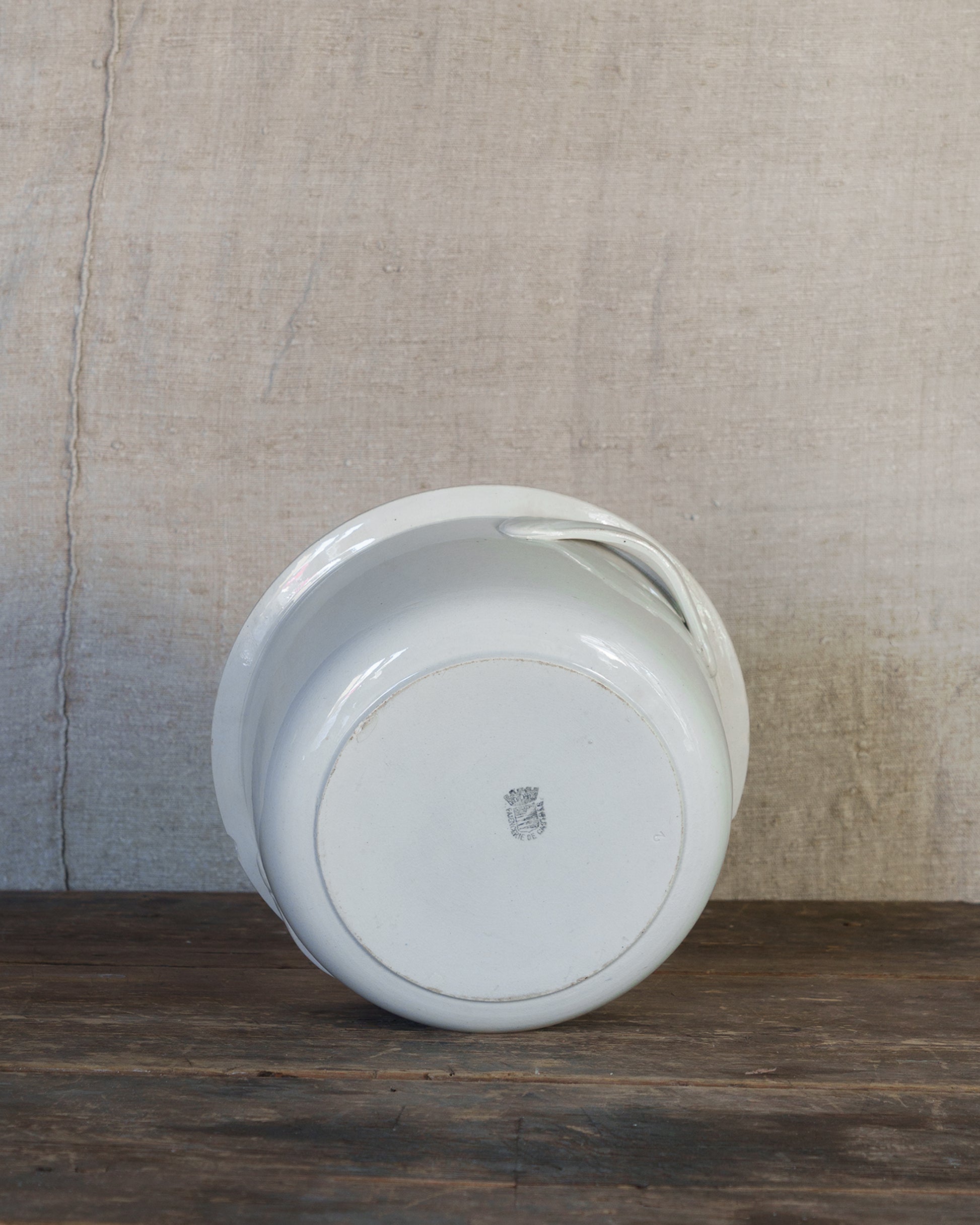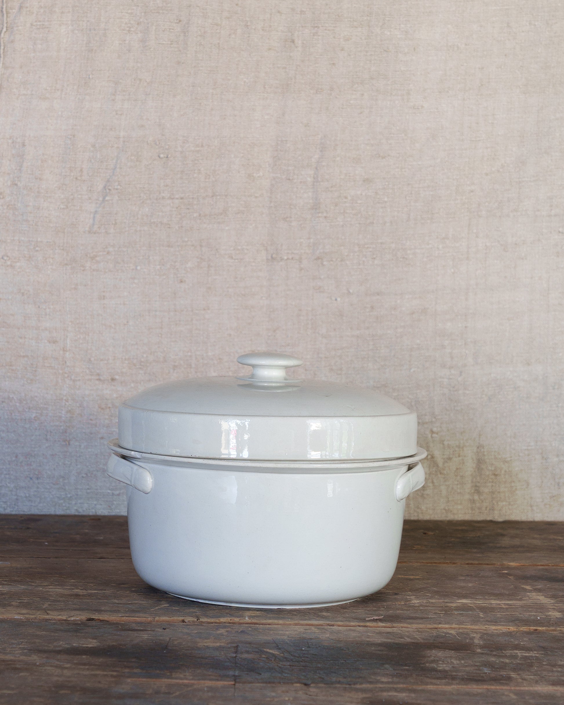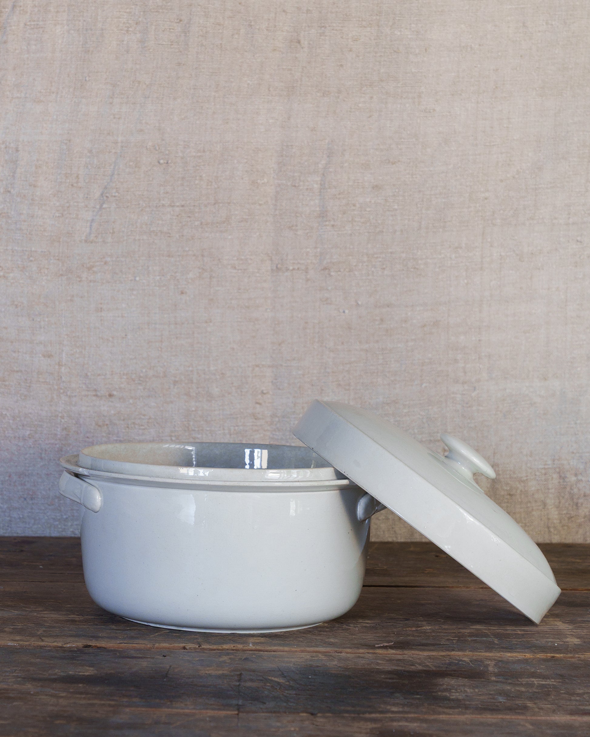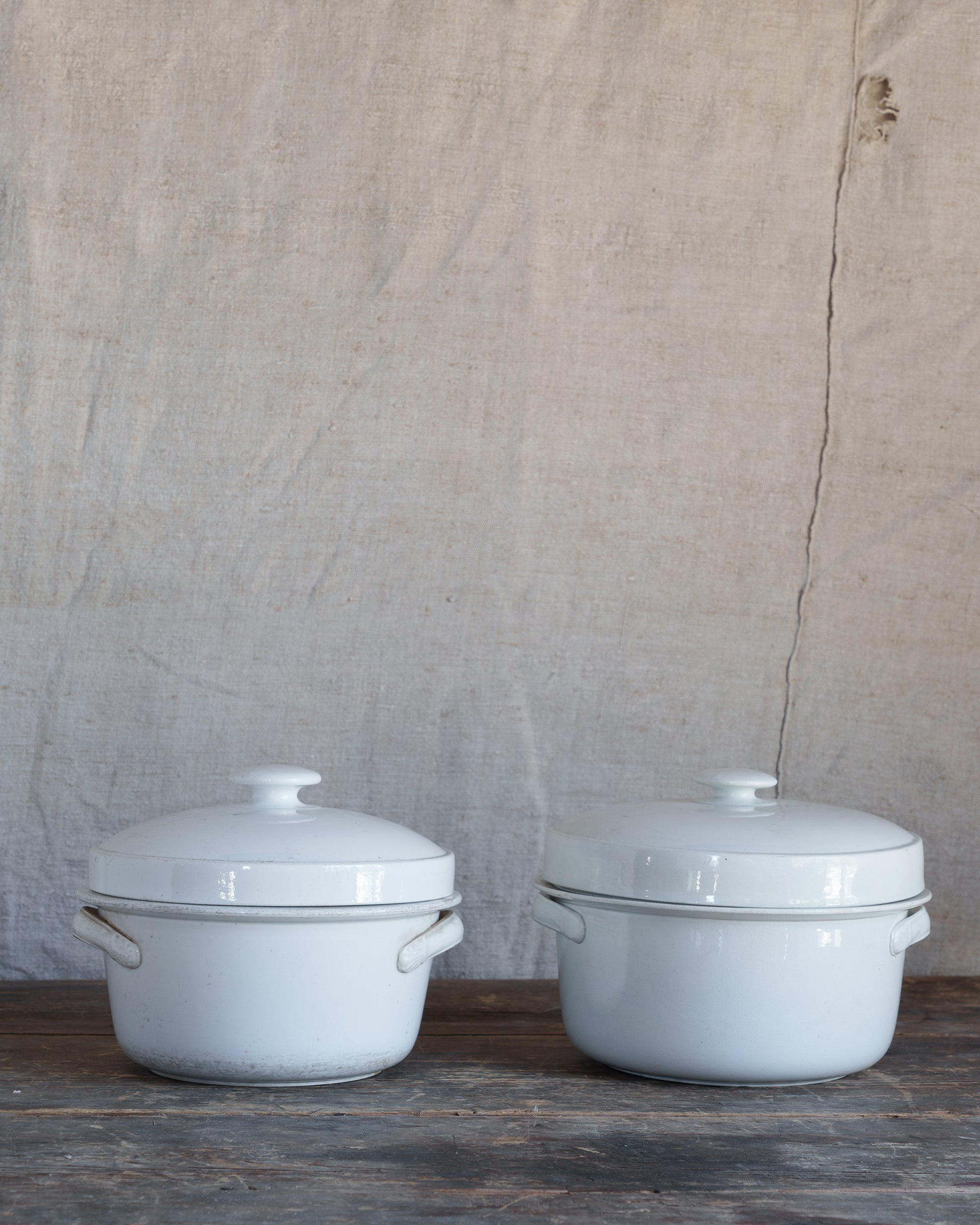 These vintage earthenware tureens were once a staple on French tables, used for serving soups and stews . Their classic form and timeworn glaze make them as beautiful on display as they are useful. Each piece is unique.