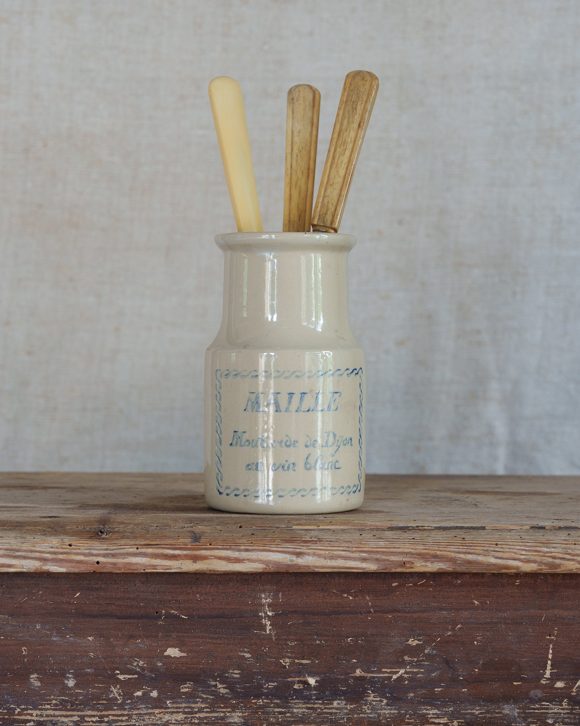 This vintage French mustard pot, in beautiful condition, makes for wonderful cutlery storage, pen storage, or a vase for cut flowers.
