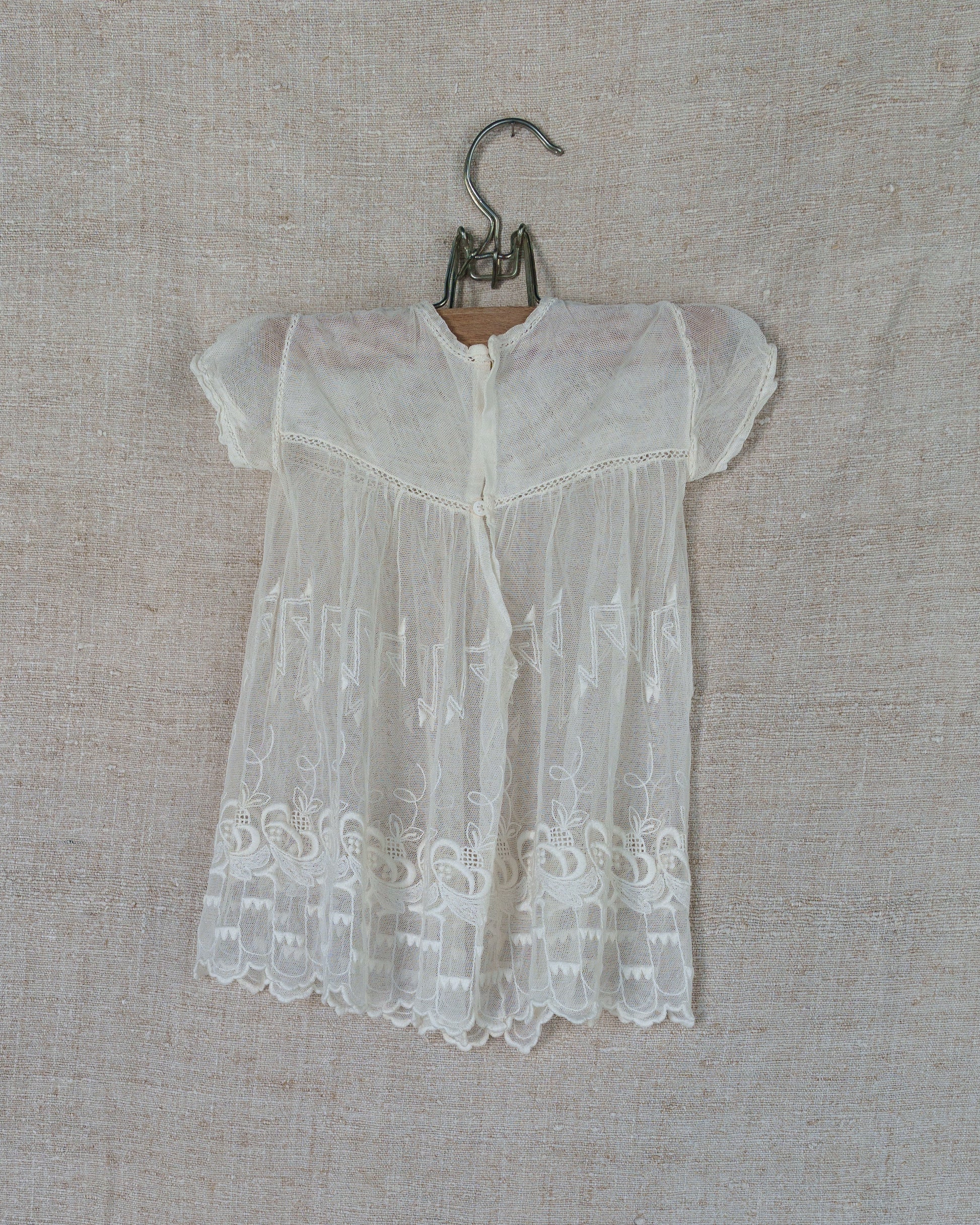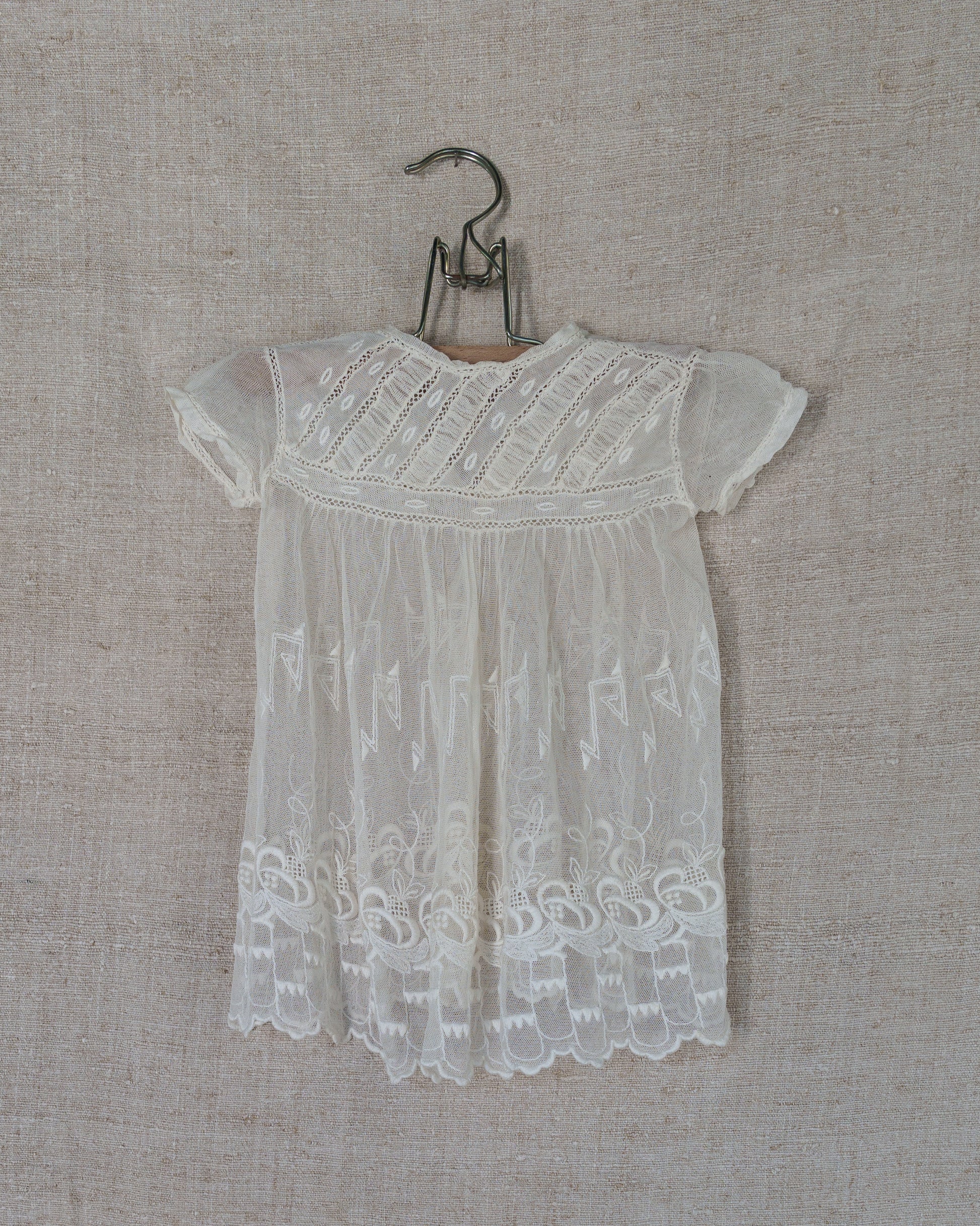 This beautifully embroidered dress has a soft cream tone and is light and sheer.